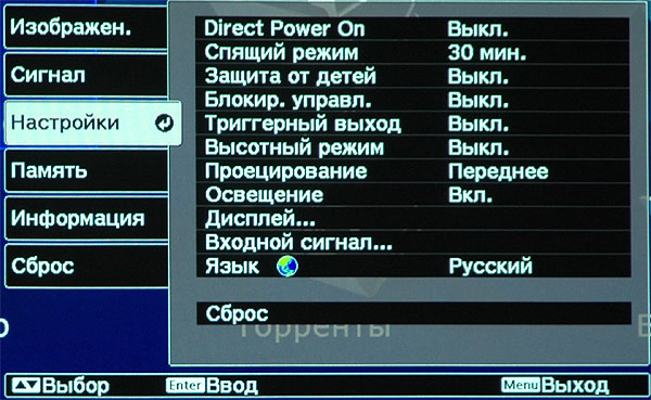 Что тут интересного? "Защита от детей" - если ее включить, то проектор будет включаться только при длительном нажатии кнопки Power, чтобы ребенок, заглянув в объектив и нажав Power, не получил мощный световой поток в глаза.