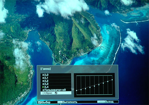 Установил проектор, отрегулировал кадр на экране в 2,5 метра по диагонали. Начал знакомиться с настройками изображения и одновременно проверять, как те или иные настройки влияют на демонстрируемые ролики. (Кстати, что удобно, на многих опциях можно вызвать разделение кадра на две половинки: на одной изображение без применения опции, на другой - со включенной опцией.)