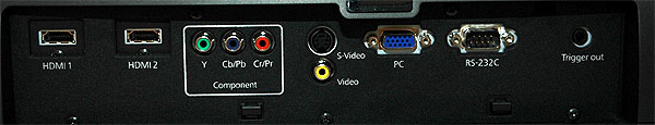 Порты на задней панели слегка утоплены. Набор тут достаточно стандартный: два HDMI, компонент, композит, S-Video, VGA, порт RS-232 и Trigger out. Автоматического распознавания источника сигнала нет, нужный вход переключается с помощью пульта или кнопки на крышке. Trigger out может использоваться для экранов с электрическим приводом. RS-232 обычно используется для обновления микропрошивки проектора.