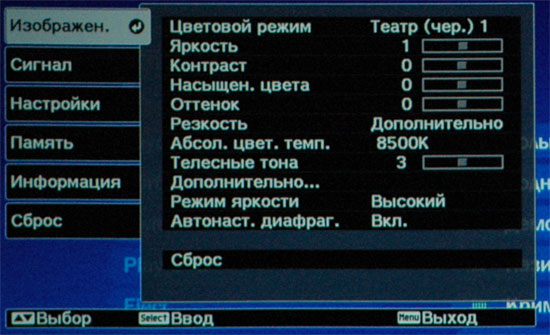 Сначала полез в общее меню. Там все просто и понятно: изображение, сигнал, настройки, память, информация и сброс. Но, несмотря на такую аскетичность, почти под каждым из этих пунктов скрывается довольно емкое подменю с самыми разнообразными настройками, которые удобно сгруппированы. Вы можете задавать какой-то из предустановленных профилей (они же доступны через отдельную кнопку пульта), настраивать яркость, контрастность, насыщенность, цветовую температуру, оттенок, резкость, телесные тона, режим яркости, дополнительные эффекты обработки и включать автоматическую диафрагму.