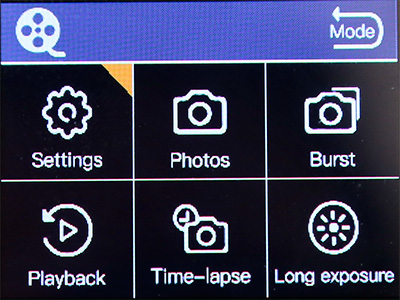 Типы съемки: видео, тайм-лапс (интервальная съемка) с получением видеоролика, просмотр отснятого видеоматериала, режим видеорегистратора, рапидная съемка.
