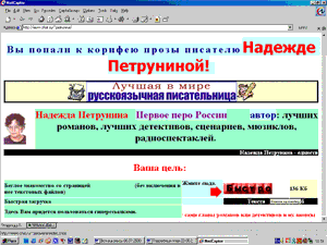 Яркий пример неимоверно кошмарного оформления. А это не домашняя страничка. Это сайт "лучшей в мире русскоязычной писательницы" Надежды Петруниной (http://petrunina.al.ru), созданный руками некоего Кузнецова В.С.