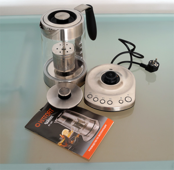 Комплект: чайник с нагревательным элементом, подставка с различными функциями и кнопками, крышка с кнопкой-ручкой, заварочный механизм, инструкция.