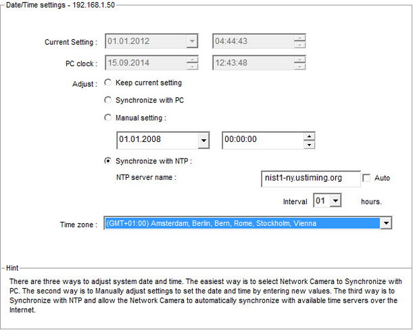 Время-дату камера по умолчанию синхронизирует с NTP-сервером, и это можно не менять, только выставьте правильно часовой пояс.