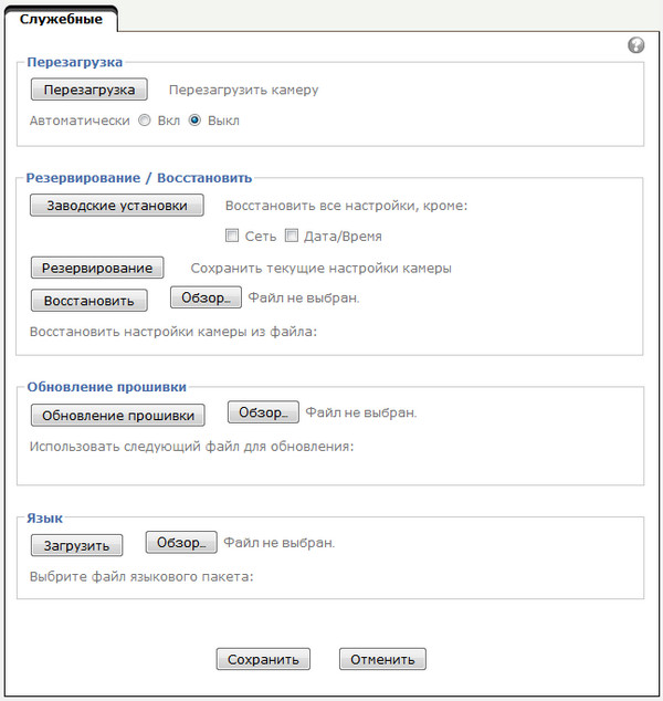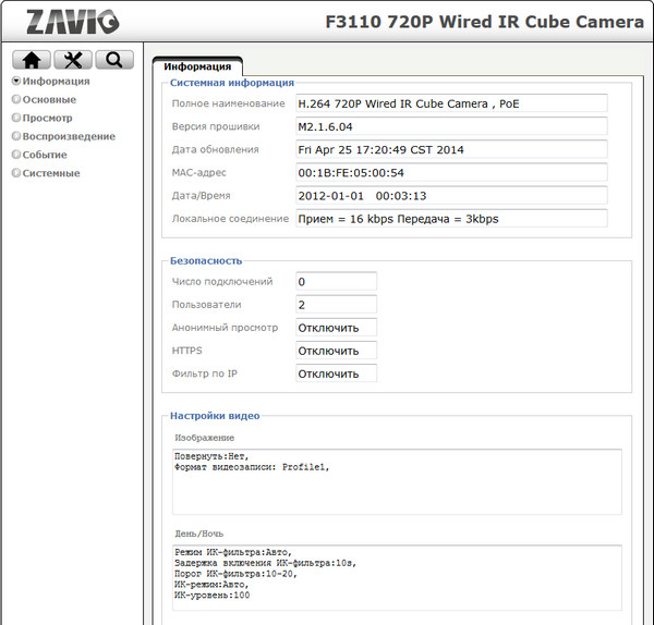 Разделсистемных настроек - "Служебные". Здесьможно сохранять и восстанавливать всенастройки, обновлять прошивку и загружатьновый языковый интерфейс. Соответствующиефайлы рекомендуется скачивать из раздела"Драйверы/документация" длясоответствующей модели камеры на сайте Zavio.Я оттуда сразу скачал самую свежую прошивкуи русский языковый пакет, которые потомустановил через этот раздел настроек.