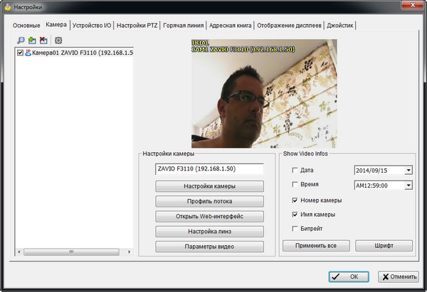 Основное окно программы. В данном случае всего одна камера, но их может быть до 64, которые можно комбинировать самыми разнообразными способами.