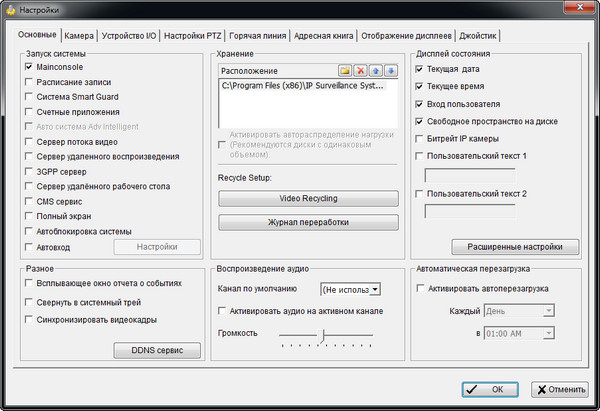 Базовые настройки. Тут самое важное - параметры видео (можно задавать несколько профайлов) и аудио.