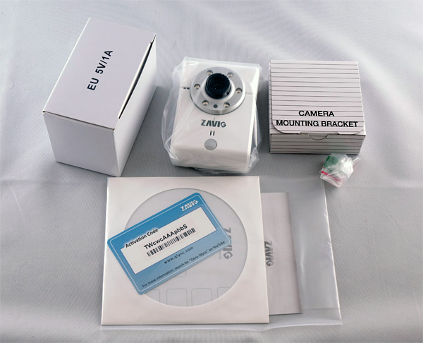 Внутри: камера, адаптер питания, крепление, инструкция, диск с ПО и карточка с кодом для регистрации камеры в сервисе удаленного доступа.