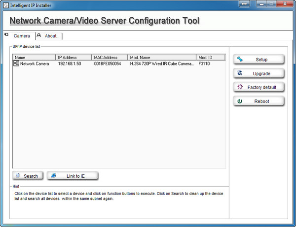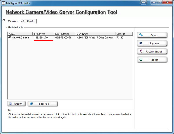 С прилагаемого к камере диска с ПО устанавливается программа Intelligent IP Installer. Эта программа обнаруживает камеру и предлагает провести ее первичные настройки.