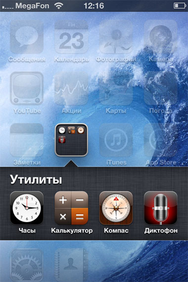 "Утилиты" - это так называемая папка. Нововведение четвертой прошивки. Теперь под одной пиктограммой-папкой может скрываться до двенадцати приложений. Папкам даются названия - точно так же, как и приложениям. Вот так выглядит папка "Утилиты".