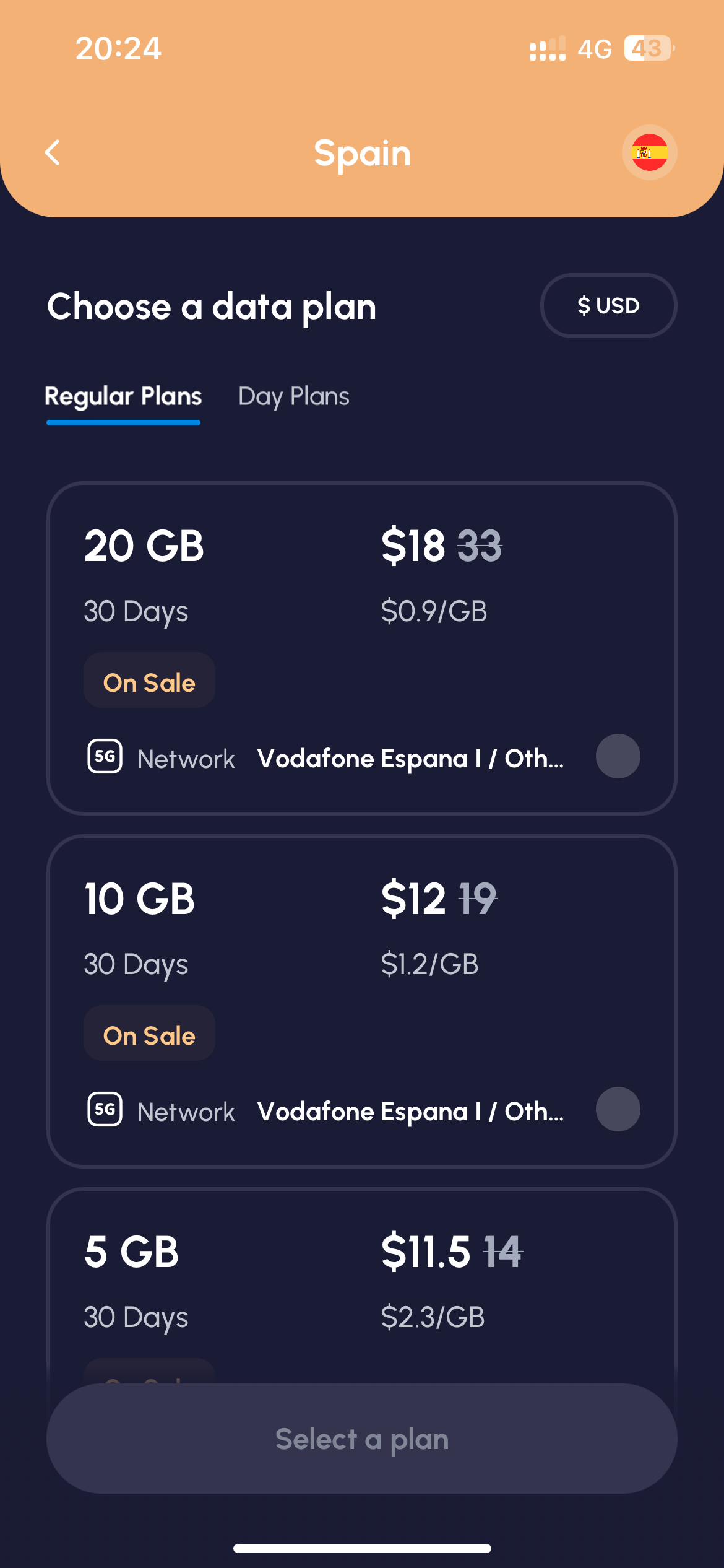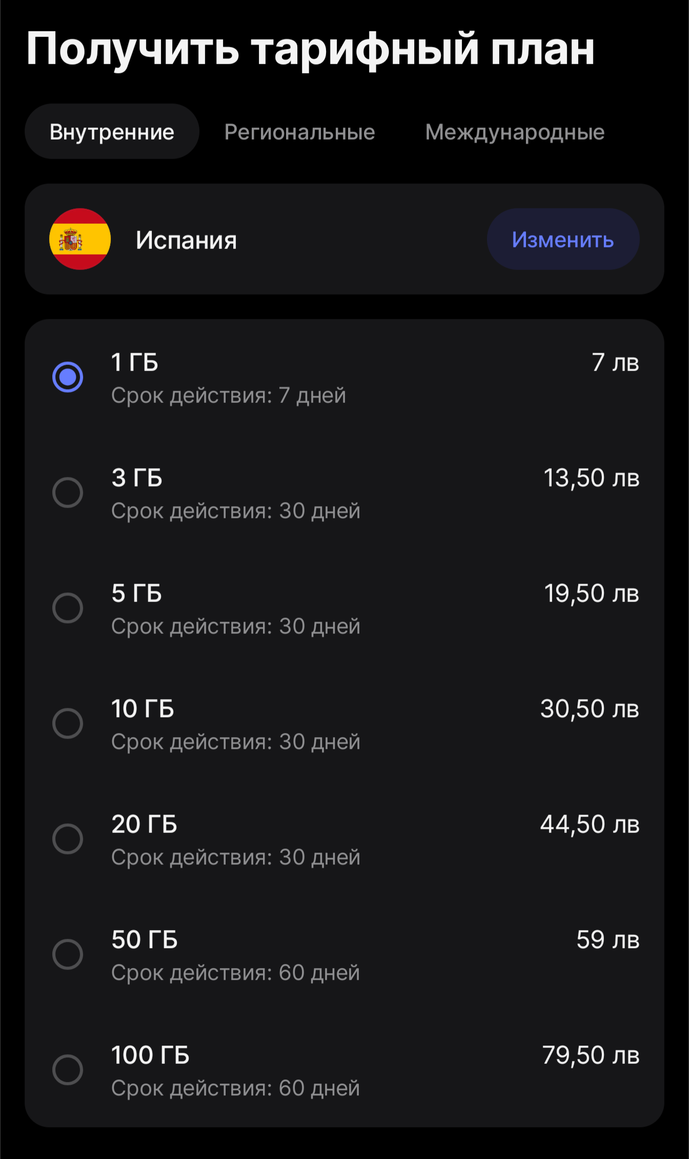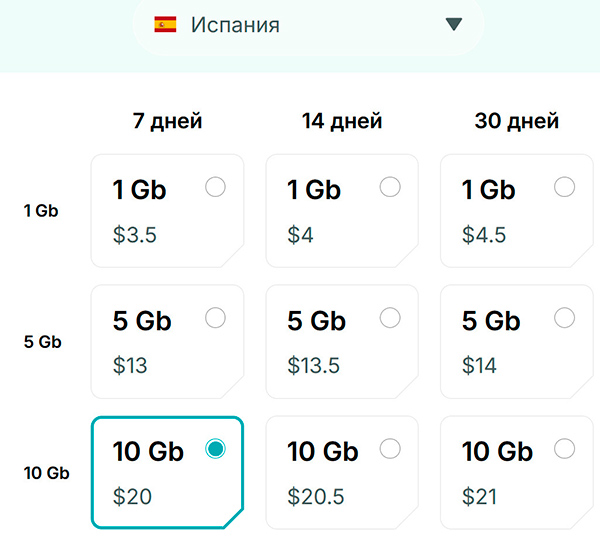 У Just eSIM - несколько другой подход. Вы сами выбираете зону (например, "Вся Европа" или конкретную страну), потребное количество гигабайт и срок действия. Чем меньше область действия (например, страна) и больше пакет - тем меньше стоимость за гигабайт. Например, для Испании 10 ГБ на неделю - $20, то есть $2 за гигабайт, а на 30 дней - $2,1 за гигабайт.
