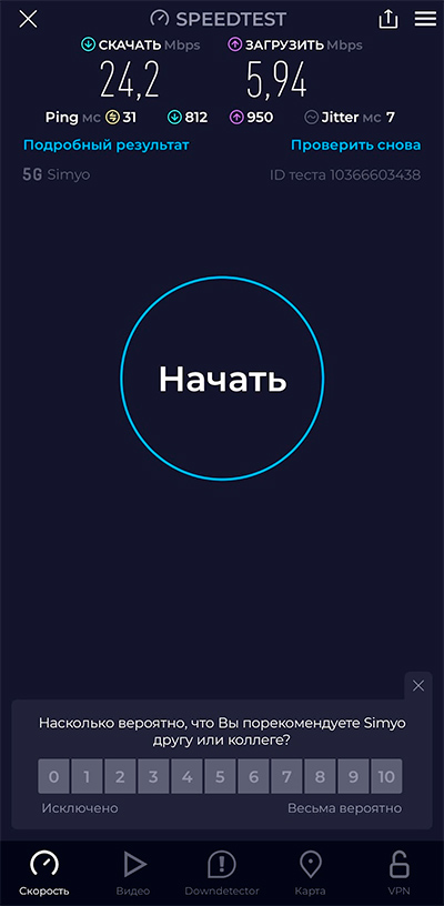 Вот, например, прямо сейчас измерял: Simyo слева, Just eSIM справа. И я проверил - Just eSIM тут в Испании использует Movistar. (Тут три основных провайдера - Vodafone, Movistar, Orange, причем раньше у Vodafone был лучший мобильный Интернет, а сейчас он практически худший - по крайней мере, в наших краях.)