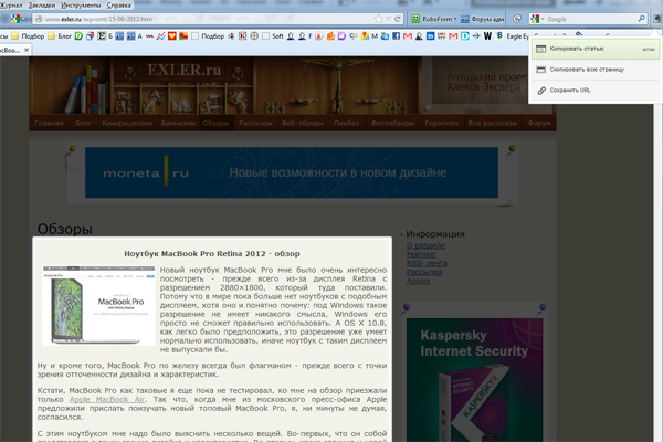 Веб-клиппер - специальная программа, доступная под различные браузеры. С помощью веб-клиппера можно сохранять в виде заметки веб-страницу, статью с веб-страницы (без лишнего оформления) и просто URL.