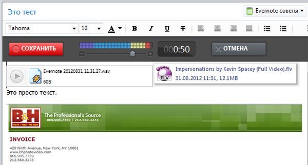 Аудио можно записывать непосредственно в саму заметку: с компьютера, телефона, планшета. В этом случае Evernote используется как диктофон, а записанный трек автоматом включается в создаваемую запись. Потом его, разумеется, можно будет сохранить в виде отдельного файла и использовать как угодно.