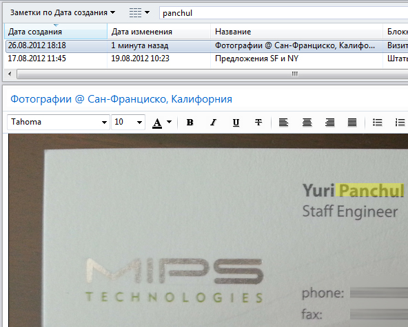 3. Визитки самых разнообразных людей. Я ненавижу хранить визитки, потому что среди них потом никогда ничего не найдешь. Теперь я их в аналоговом виде и не храню. Сделал заметку, сфотографировал визитку - и выкинул ее: Evernote проиндексирует данные и я потом смогу найти этого человека хоть по имени, хоть по фамилии, хоть по должности, хоть по названию компании.