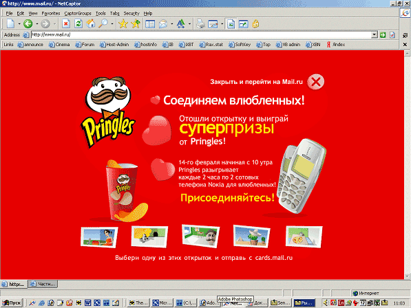 Проводником новых методов стала компания Mail.ru. На их сайте (www.mail.ru) с 12 февраля появилось нововведение - огромный красный баннер во весь экран. Тысячи пользователей, зайдя утром 12 февраля, вместо mail.ru вдруг увидели чипсы, которые соединяли влюбленных и занимались еще каким-то непотребством. Все это живенько и бодренько некоторое время летало на экране, после чего там все-таки появлялась строчка "Закрыть и перейти на Mail.ru".