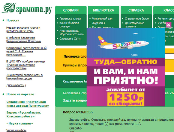 Всплывающий флешовый баннер на сайте Gramota.ru