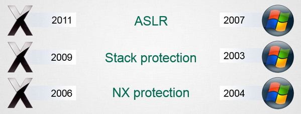 Кстати, по поводу того, где раньше появились технологии защиты ASLR (случайное изменение расположения в адресном пространстве), Stack protection (блокировка прямых атак) и NX protection (предотвращение выполнения данных) - как вы думаете, где именно?
