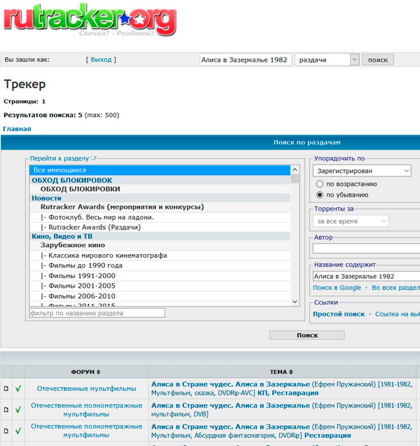 И, кстати, запрос для сервиса формируется вполне грамотно. Например, я искал "Алису в Зазеркалье" 1982 года - вот так был сформирован запрос для Rutracker.