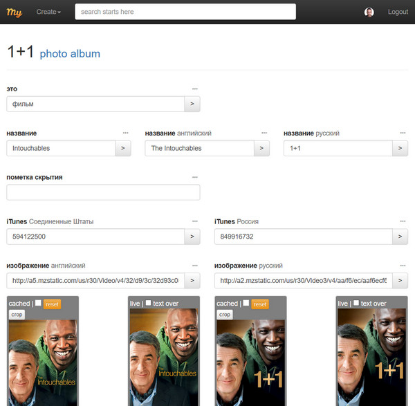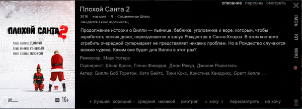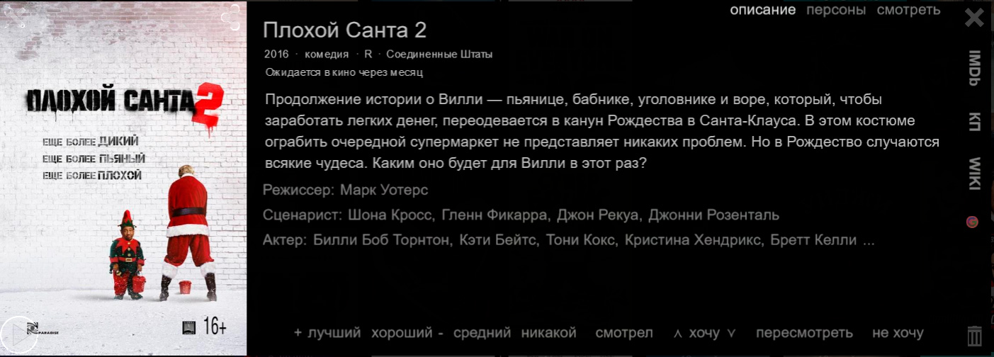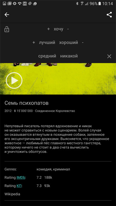 При нажатии на любую обложку выводится карточка фильма (сериала), в которой даются описание и состав: режиссер, сценаристы и актеры. Там же можно поставить свою оценку или отметку (посмотреть, пересмотреть, не хочу) и есть ссылки на IMDB, "Кинопоиск" (вместе с оценками), на Wikipedia и поиск в Google.
