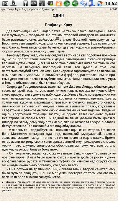 Недостатки - точно такие же, как у ZT-180. Ужасный резистивный экран, тормоза, плохая реакция на свои же кнопки. Однако аккумулятор живет заметно дольше - читать удается часов пять.