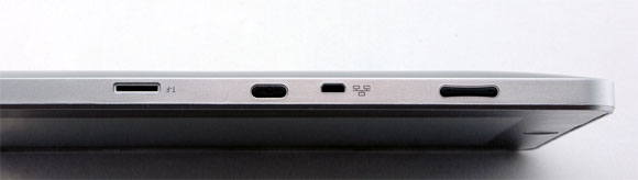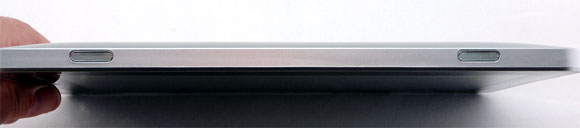 На правом боковом торце - порт для Ethernet-переходника, слот для microSD, кнопка питания, а также качелька, которая вроде как должна быть настройкой громкости, но в силу некоторых особенностей конструкции мозгов разработчиков - это "Меню" и двойной "Домой" (именно двойной, вызывающий список последних запущенных задач).