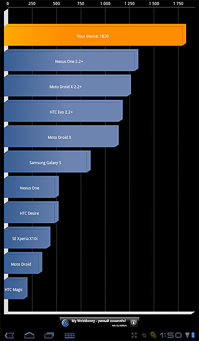Измерил быстродействие с помощью программы Quadrant. Получил общий индекс быстродействия в 1830. У Samsung Galaxy Tab 10.1 средний индекс получился 1993, а у XOOM было 1926.