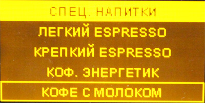 При нажатии на кнопку "Специальные напитки" можно получить следующие варианты: горячая вода, крепкий кофе, легкий эспрессо, крепкий эспрессо, кофейный энергетик, кофе с молоком.