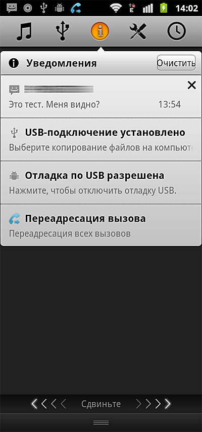 Область уведомлений, расположенная сверху, обзавелась вкладками, при нажатии на которые открываются соответствующие подразделы. Причем в некоторых вкладках можно делать различные настройки - например, включать-выключать беспроводные сети.