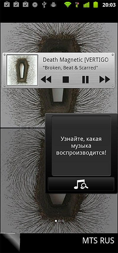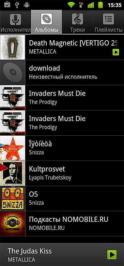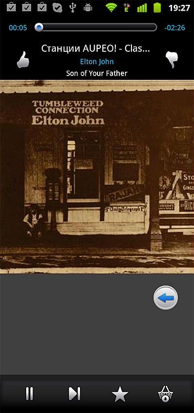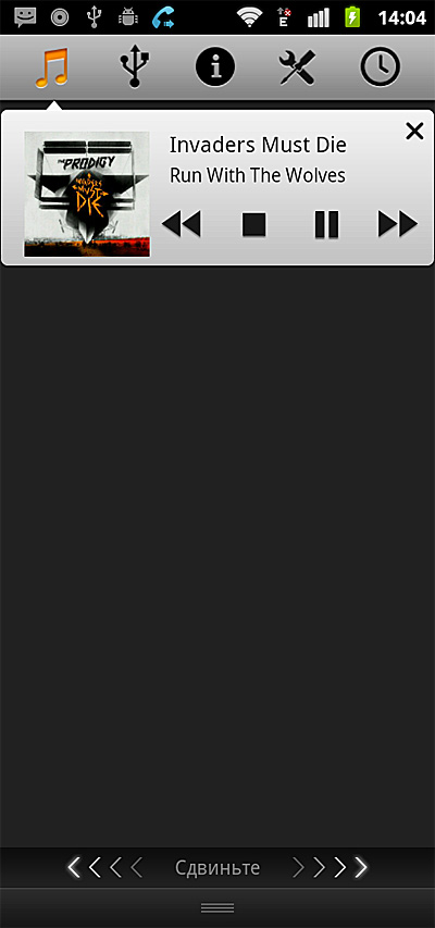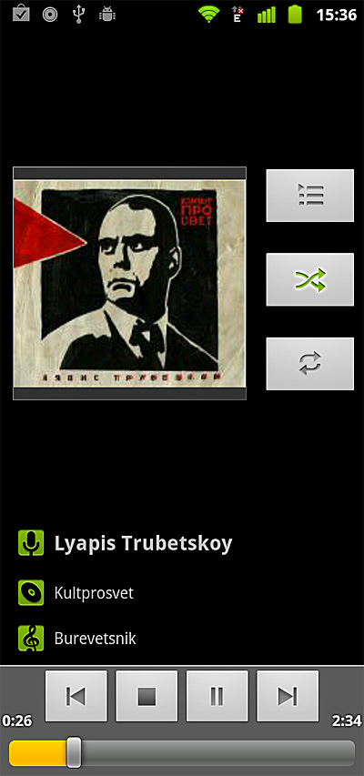 Прослушивание аудио - стандартное андроидовское приложение. Выглядит не особенно стильно, но свою задачу выполняет.