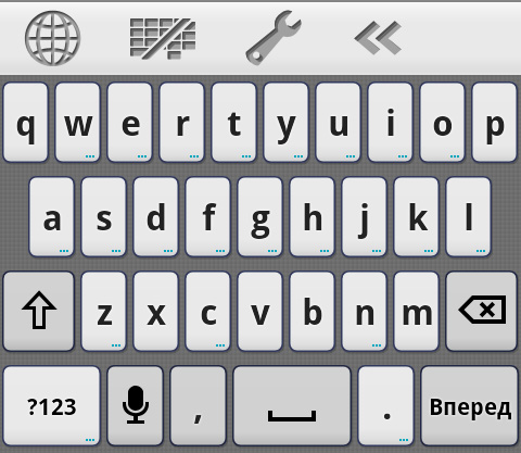 Везде, где снизу видно многоточие, по длинному нажатию вызываются всякие дополнительные символы национальных алфавитов. Вверху пиктограммы: переключение языков, переключение на телефонную клавиатуру (двух видов) с поддержкой T9, настройки, скрытие всех пиктограмм, кроме переключения языков.