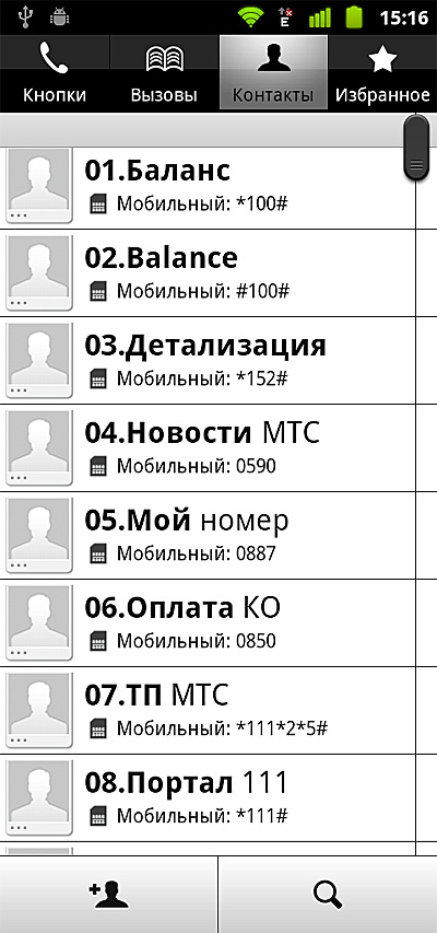 Телефонное приложение - более или менее стандартное, андроидовское. Поиск по контактам делается при нажатии заметной большой кнопки. Однако я бы предпочел, чтобы строка быстрого поиска была доступна сразу, как в Samsung Galaxy S.