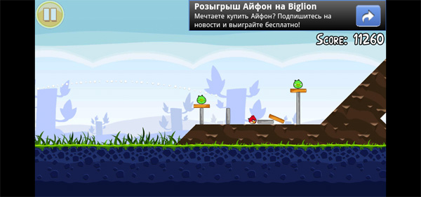 Большинство игр также воспроизводятся с темными полосами по краям - не понимают такой формат. Загрузил птичек. Играется нормально: птички летают бодро, свинки помирают с предсмертным хрюком.