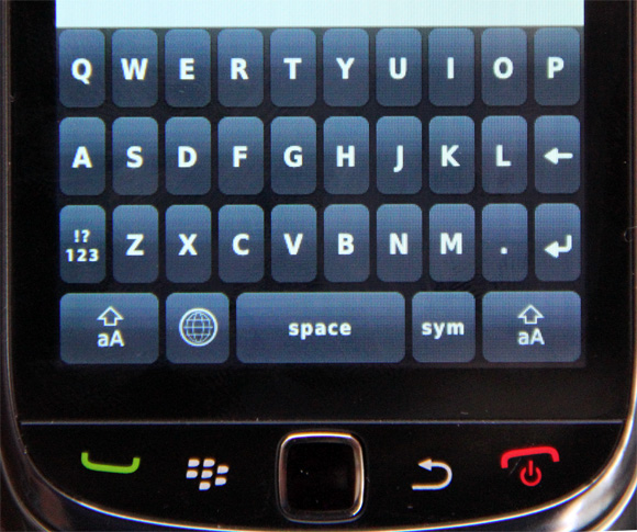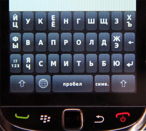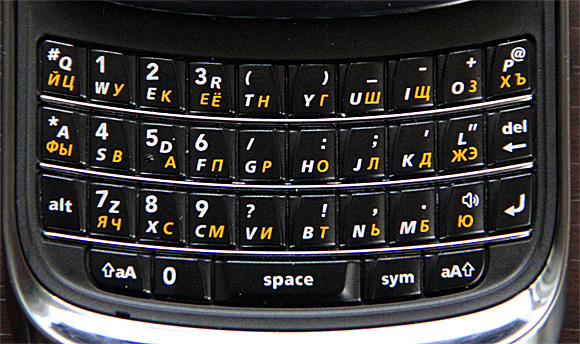 Выдвижная клавиатура - фирменный стиль коммуникаторов BlackBerry. Однако здесь клавиатура совсем миниатюрная, и я, если честно, не очень понимаю, как ее можно использовать. Я своими-то небольшими пальцами по ней еле попадаю, и мне значительно удобнее пользоваться экранной клавиатурой, а уж каково людям с крупными пальцами - даже представить трудно.