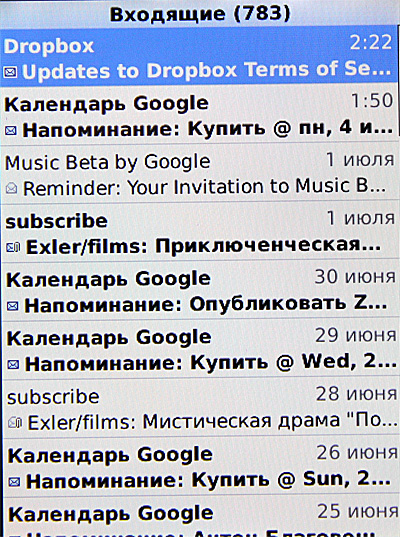 BlackBerry как раз и славится своей защищенной почтой, которая активно используется в корпоративном секторе США (у них эти телефоны - на первом месте по продажам, обгоняя и iPhone, и устройства на Android), но мне эта почта - совершенно не актуальна, поэтому я скачал приложение GMail и посмотрел, как оно работает. Нормально работает - так же, как и на любом другом коммуникаторе.
