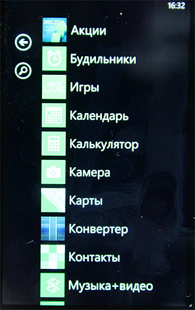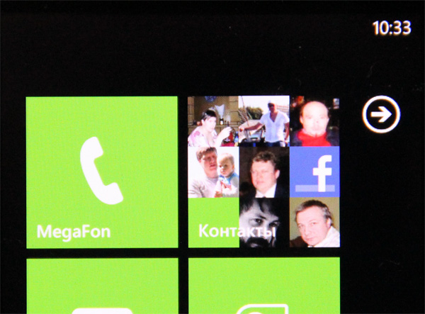Примерно пятую часть экрана по вертикали занимает совершенно черный столбец с маленькой стрелкой вправо, находящейся вверху, - с ее помощью можно перелистнуть экран и переместиться на список всех приложений. Учитывая тот факт, что точно так же экранные страницы можно перелистывать обычным горизонтальным жестом пальцем по экрану, это решение я как считал как минимум идиотским, так и продолжаю считать. Во всех остальных операционках пользователи как-то догадываются и без стрелочки, что экран можно сдвигать туда-сюда, а вот своих пользователей в MS, судя по всему, считают идиотами.