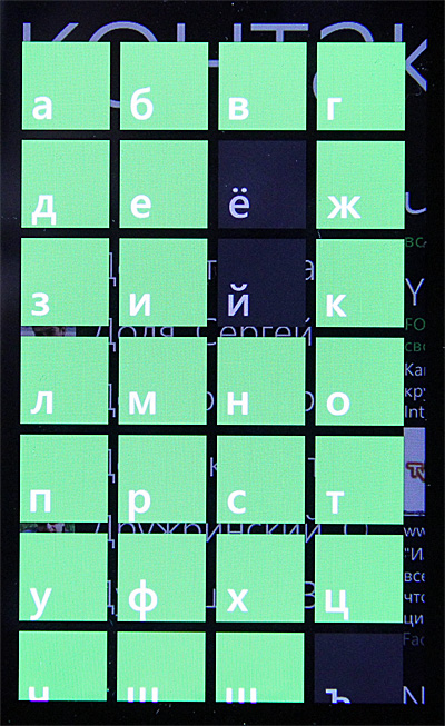 В любой момент можно нажать на букву алфавита, расположенную слева сверху, после чего появляется удобное окно выбора нужной буквы (русская и латинская раскладки).