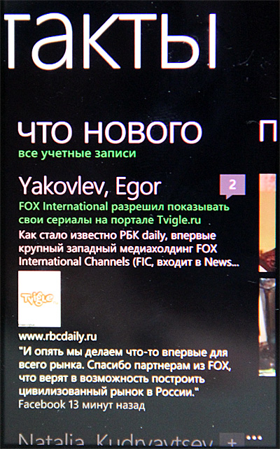 Очень нравится синхронизация всех контактов. У меня мои контакты всегда были в Exchange. После подключения к Facebook с удивлением обнаружил, как резко возрасло количество фоток в адресной книге - он сам оттуда вытащил и поставил в соответствие тем контактам, которые у меня были без фото.