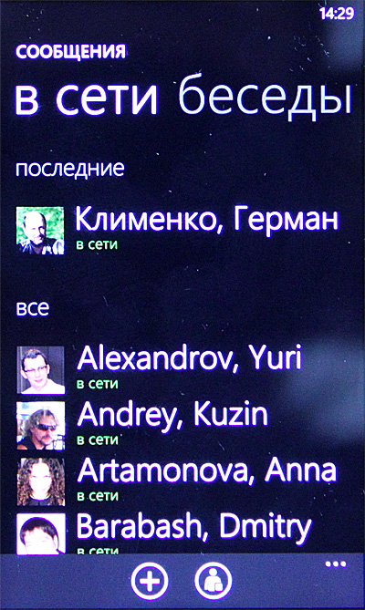 Вторая страница в сообщениях - контакты, находящиеся на линии в социальных сетях.