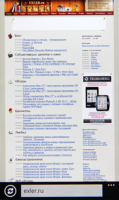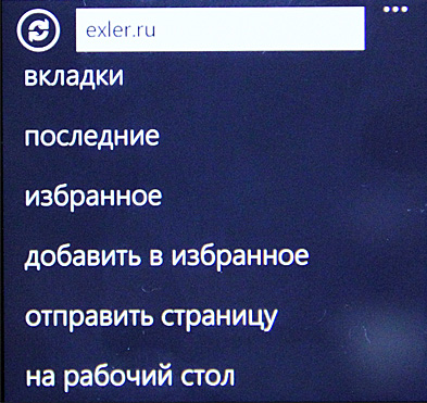Браузер тут хорошо продуман с точки зрения использования в мобильных устройствах. Никакого верхнего меню - только адресная строка снизу и кнопка меню, так что экран остается почти полностью свободным для отображения страницы.