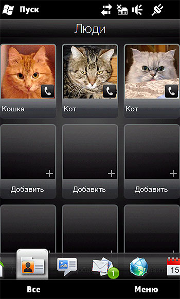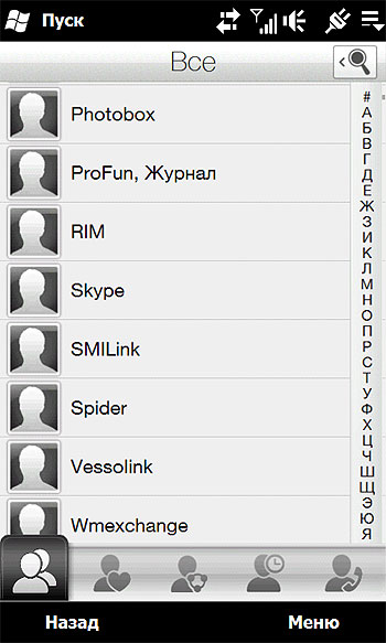 Кроме закладки с вызовом контактов по пиктограммам у HTC своя собственная вся система работы с контактами, которая очень выгодно отличается от дурдома из Windows Mobile. Выглядит это следующим образом: