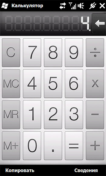 Калькулятор тут собственный. Намного более удобный, чем в WM 6.5. Однако простенький, без изысков. Впрочем, если экран развернуть, появится продвинутый калькулятор с кучей функций.