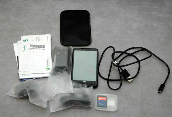 Комплектация традиционная: чехол, кабель USB-microUSB, стереонаушники, адаптер питания, документация, диск с ПО и microSD-карта на 2 Гб с переходником, содержащая полный комплект карт для "Навител Навигатор 3.2".