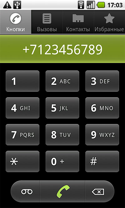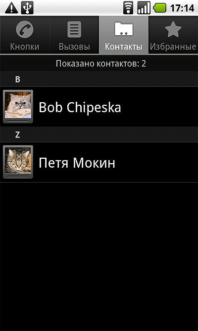 Сверху идут закладки, с помощью которых можно получить список вызовов, контакты и избранные контакты.
