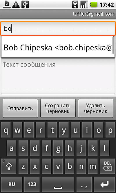 При создании нового письма список контактов с электронными адресами вызвать нельзя, но нужное значение оттуда подбирается с помощью быстрого поиска.