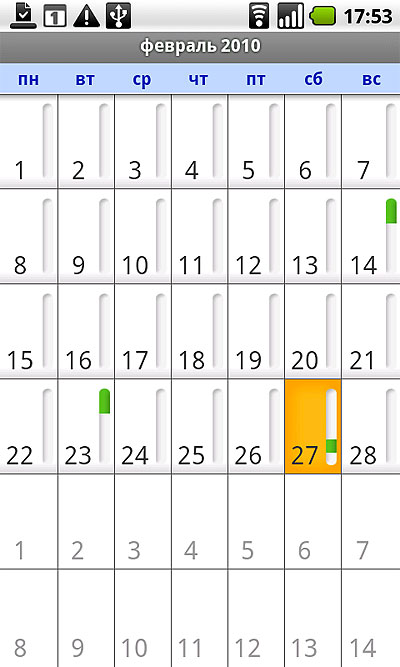 Календарь здесь простенький, но свои задачи выполняет. Его, как обычно, можно представлять в виде дня, недели и месяца.