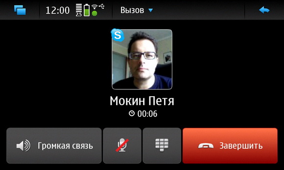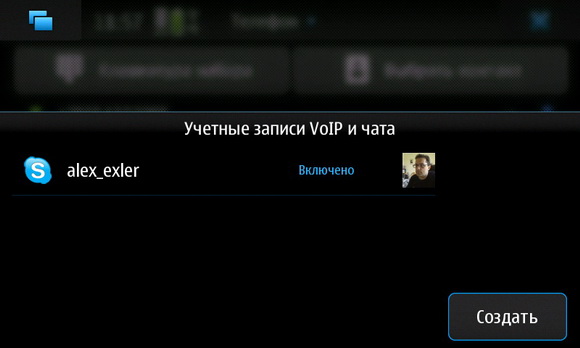 N900 позволяет в телефонном приложении задавать VoIP и мессенджеры. Вот, например, зарегистрированный и загруженный Skype.