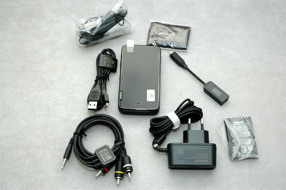 В комплект кроме самого устройства входят: адаптер питания microUSB, кабель USB-microUSB, переходник с USB на стандартный разъем питания Nokia, стереонаушники, видеокабель, салфетка.