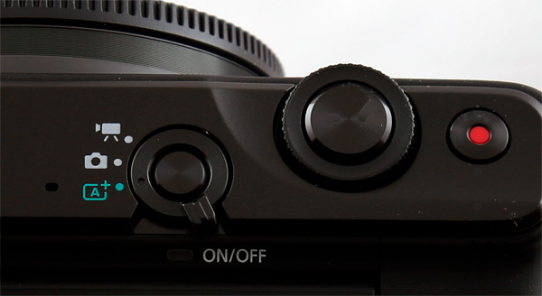 В верхней части камеры расположены: кольцевой переключатель между полностью автоматическим режимом, режимом программного автомата и видео, кнопка питания (внутри кольца-переключателя), кнопка съемки и кнопка видео.