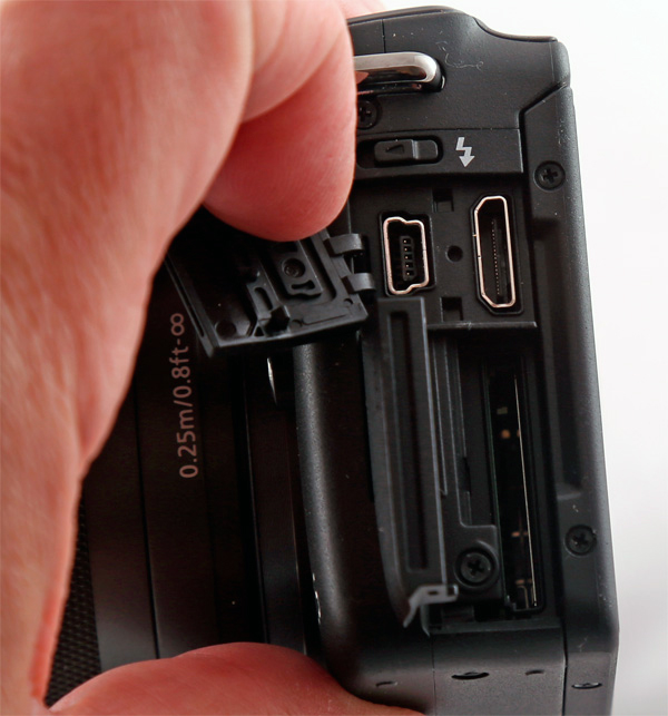 На левом торце две пластиковые заглушки, под которыми скрываются: слот для SD-карты, порты miniUSB и miniHDMI. Слот miniUSB предназначен только для связи с компьютером, заряжать с его помощью аккумулятор нельзя, это вам не Sony.
